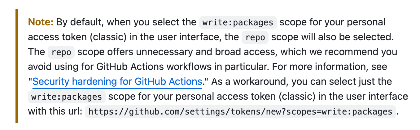 I skimmed the docs for Authenticating to the Container Registry which told me I needed to create a Personal Access Token (classic) to publish/install/delete packages. Easy enough. Scrolling down further was a Note that made me chuckle/cry....by default the token scope is set too broad (aka violating the Principle of Least Privilege) and the recommended workaround was to hack the URL 🤦♀️.
