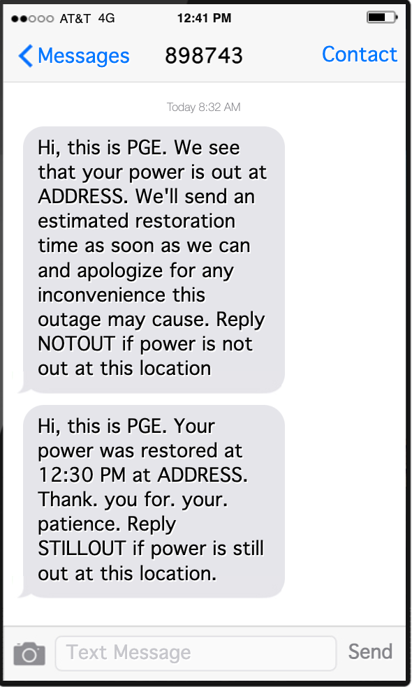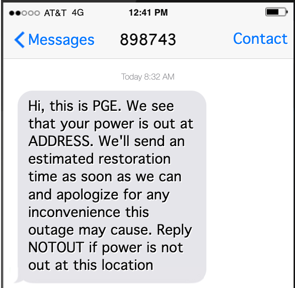 When I get these texts I'm somewhat assuaged because I know that the PGE is aware of the problem and are actively working to resolve it. This frees me up to focus on safely shutting down my pet server, gather flashlights and start the clock for fridge/freezer food safety.