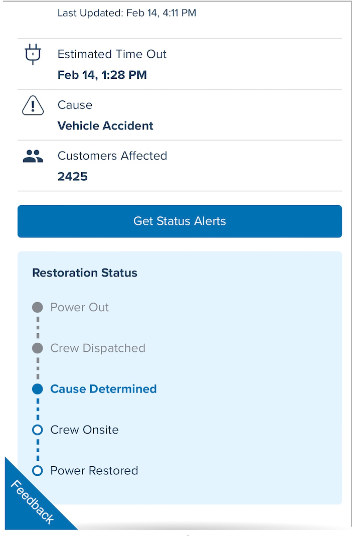 - Simple stages of an outage with key moments highlighted for customers - especially "crew dispatched" which means help is on the way!