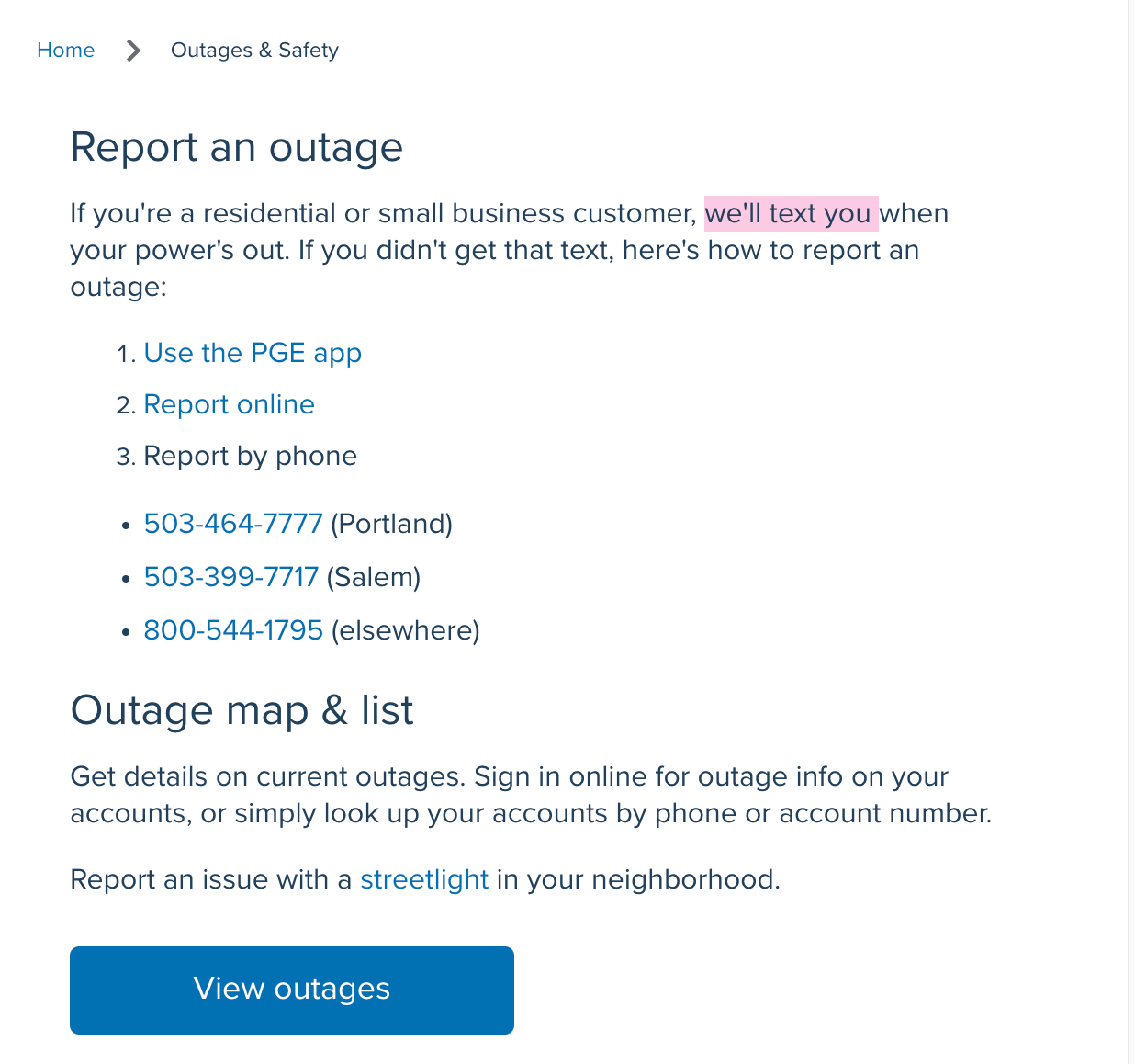 Say a customer hasn't signed up for text alerts...navigating to their website the Outages & Safety section is a permanent part of their main menu bar and provides a plethora of ways to report outages.